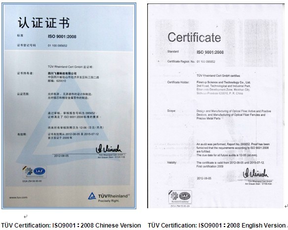 Since the foundation of our company in 2008, we established and improved the full set of quality management system and obtained the first certification of Rhine TÜV ISO9001:2008 (Certificate NO. 01 100 095652) on June 13, 2009.