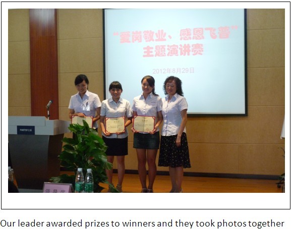 The speech contest on “dedication to job and gratitude to Finetop” was hosted by Trade Union and co-organized by Administrative Department and Human Resources Department, it was held at multi-function hall of our company .13 contestants from Product Department, Engineering Technology Department and Management Department took part in the competition. Leaders of our company Zhao Yanbi, Zeng Qingzhi, Zhang Weidong, department managers and employee representatives watched the contest. The contestants present us an impressive and inspiring speech with their full passion and personal feeling, telling ordinary but touching stories about their devotion to job or striking examples of struggle creating the future. The competition result came out after the rating by judges: first, second and third prizes were awarded to Zhu Qin from Production Division I, Huang Haiyan from Quality Department and Bu Xiu from Human Resources Department.