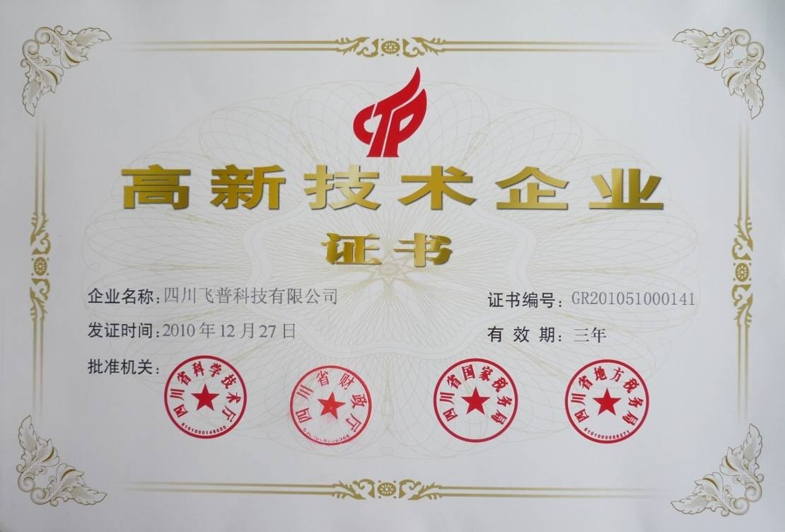 月,公司获得了四川省科技厅、财政厅、国税局、地税局等联合颁发的高新技术企业证书。