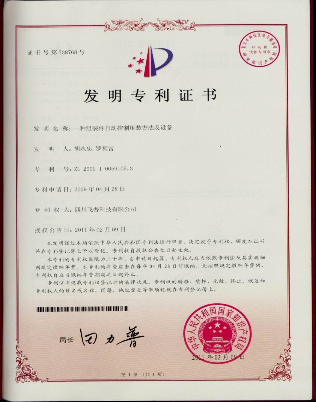 月,公司申报的一种组装件自动控制压装方法及设备发明专利获得了国家专利局颁发的发明证书。